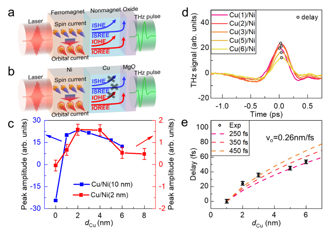 近期的一些研究发现,电流能够通过轨道霍尔效应或轨道Rashba-Edelstein效应形成轨道流,并能够对磁化产生转矩,即形成轨道矩。根据Onsager倒易关系,轨道霍尔效应或轨道Rashba-Edelstein效应的逆效应能够将轨道流转化为电荷流。研究团队通过太赫兹光谱的方法探测到Ni/NM/MgO多层膜中光诱导的轨道-电荷转换,通过分析Ni/Cu/MgO多层膜中Cu对太赫兹发射谱的影响,发现在Cu/MgO界面处轨道流通过逆轨道Rashba-Edelstein效应形成超快电荷流。