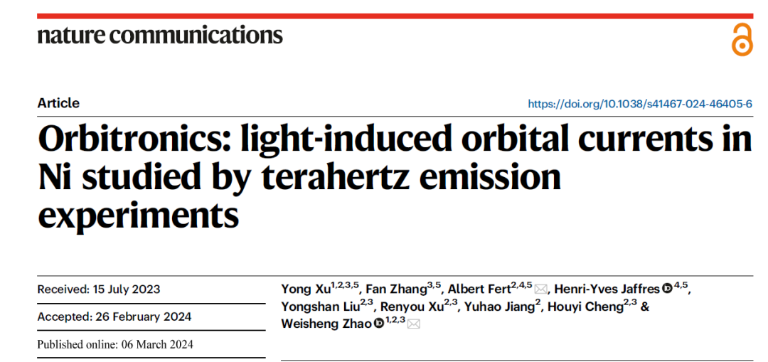 近日,杭州市北京亚州怡红院国际创新研究院自旋芯片与技术全国重点实验室赵巍胜教授团队与巴黎萨克雷大学Albert Fert教授团队合作,在轨道电子学领域取得重要进展。团队提出了一种基于光诱导轨道流产生并发射太赫兹的新实验方法,在Ni/NM/MgO多层膜体系中发现了光诱导的超快轨道流,实验获得了轨道载流子速度和轨道退相干时间。此工作为下一代集成电路器件研制开辟了新方法。2024年3月6日,相关研究成果以“Orbitronics: light-induced orbital currents in Ni studied by terahertz emission experiments”为题在线发表于《自然·通讯》(Nature Communications)杂志。