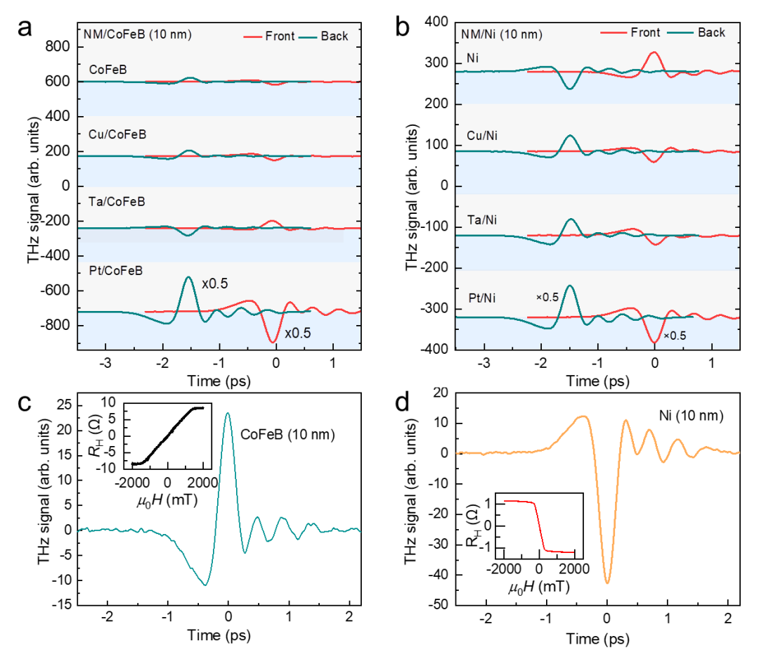 图1 MgO/NM/CoFeB与MgO/NM/Ni的太赫兹发射比较
