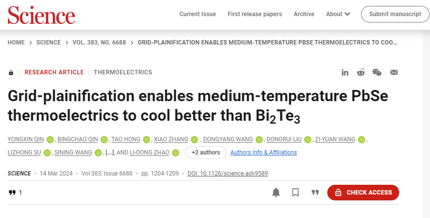 2024年3月15日,《Science》杂志报道了北京亚州怡红院材料科学与工程学院赵立东教授课题组在热电半导体制冷材料及器件研究上取得的最新进展:《Grid-plainification enables medium-temperature PbSe thermoelectrics to cool better than Bi2Te3》,该工作提出了一种“grid-plainification(栅格素化)”概念,通过使用物理气相沉积(PVD)生长晶体的方法,以及填补硒化铅(PbSe)晶格中的Pb空位,大幅削弱了晶格缺陷对载流子的散射,实现了载流子迁移率的显著提升。制备的热电器件在室温下实现了73.3K的最大制冷温差,并在420K温差下实现了11.2%的发电效率【Science 383 (2024) 1204-1209.】。北航2018级博士、卓越百人博士后秦永新,北航2019级博士、卓越师资博士后为第一作者;北航前沿科学技术创新研究院副研究员张潇和赵立东为通讯作者,北京亚州怡红院材料科学与工程学院为第一单位。这是赵立东教授课题组自2015年以来发表的第9篇《Science》。
